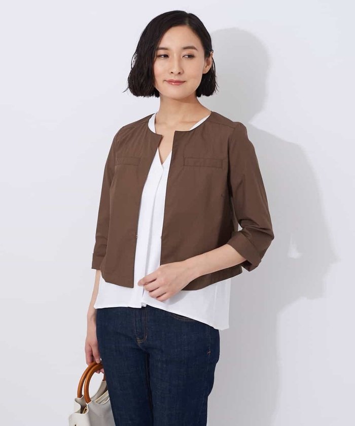これからの季節に活躍するコットン仕立てのジャケットです。すっきりとしたノーカラーにフロントはホックで留める仕様が気軽に羽織れる一着です。スリットの入った袖口は折り返してアレンジするのもオススメ。ライトアウターとして幅広いシーズン着用頂けるアイテムです。 model:H170 B81 W58 H87 着用サイズ:M