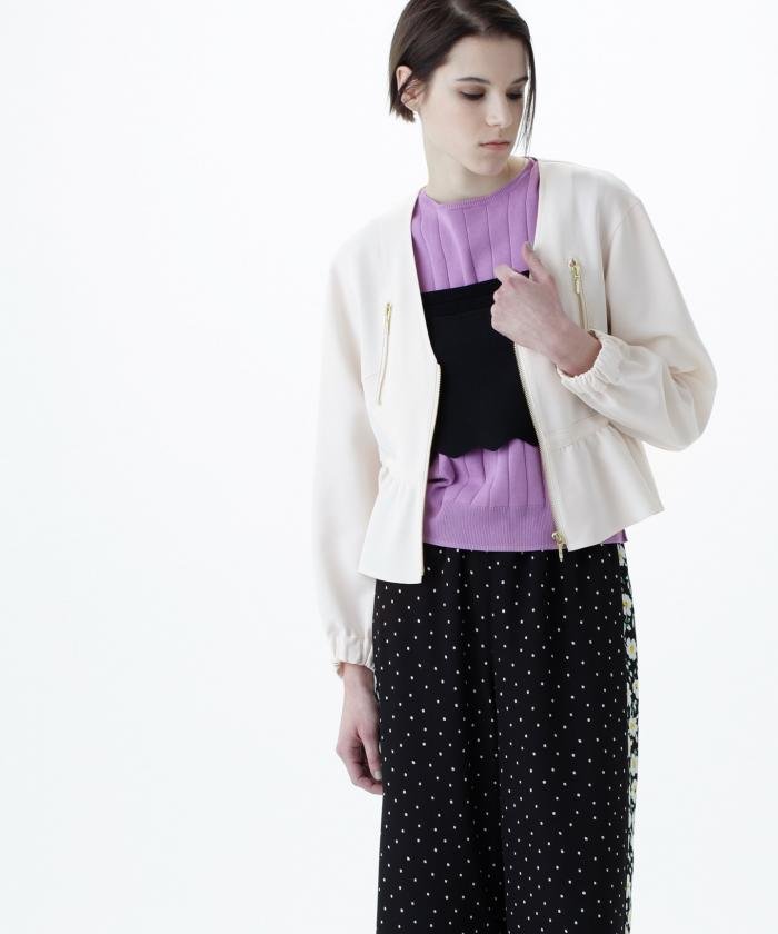 トリアセ混合の落ち感の良い素材を使用したフリルブルゾン。カジュアルになりがちなブルゾンにギャザーをよせフリルディテールを取り入れたフェミニティ薫るデザイン。身頃には存在感を発揮するファスナーディテールをあしらいメリハリを持たせたアクセントをON。綺麗めな風合いでシーズンスタイルに溶け込む女性らしい一着です。今季注目のスポーティな雰囲気がぐっとトレンド感あるコーディネートへと導く旬なお品。