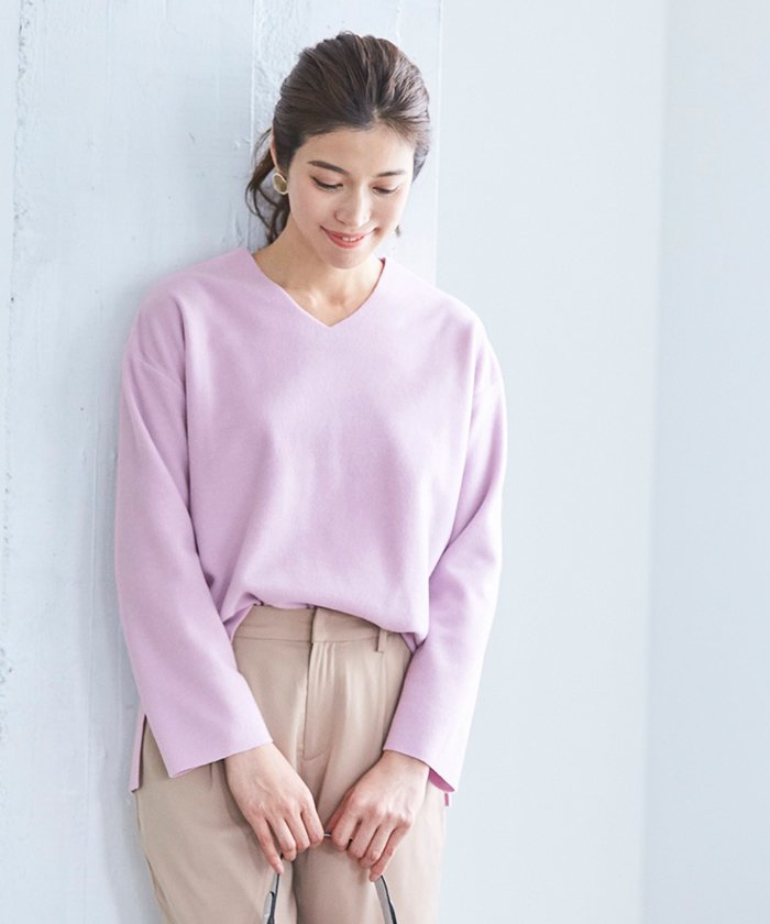 トレンドのゆったりとしたシルエットがリラックスムードを高めるVネックプルオーバー。 程良い厚みのボンディング生地で、こなれ感のあるボリュームを演出してくれます。 Vネックデザインで顔周りをすっきりと見せてくれるのも高ポイント。 裾部分のスリットでトップスインもしやすく、幅広いスタイリングに使える優秀アイテムです。