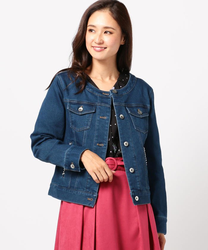バックのレースアップデザイン、顔まわりをすっきりと仕上げるノーカラーが今季らしい雰囲気で着こなせるブルゾンです。パールやビジューを飾ったサイドポケットの大人可愛いディテールがポイント。ライトなアウターは季節の変わり目に大活躍。