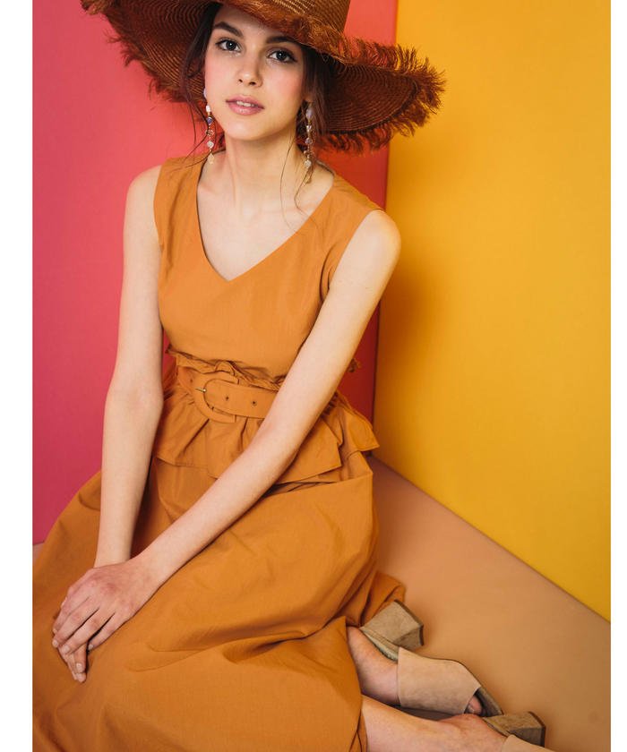 1枚でこなれたスウィートムードが漂うワンピース。サッシュ風フリルデザインベルトが可愛いポイントで今年らしい雰囲気が漂います。取り外し可能なベルトはバックファスナーで付け外ししやすい仕様です。軽くて綿タッチな素材でお作りしていてしわになりにくいのでキレイにご着用いただけます。デコルテはVネックでスッキリとした印象で夏らしい色合いが可愛くリゾートにも着たい1着。 ■model:163cm 着用サイズ:M