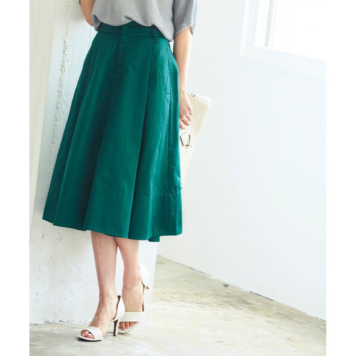 今季トレンドのハリのあるチノ生地を使用したフレアスカート。 フロントタックデザインによる立体感のあるフレアラインが女性らしい印象に。 今から秋口までロングシーズン活躍する優秀アイテム。 コンパクトなトップスを合わせて颯爽と歩きたくなる一枚です。