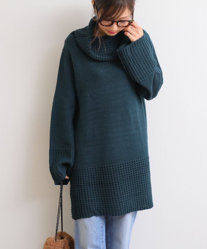 ざっくりとしたワッフル調の編地と 天竺編みを切り替えたデザインが ボリューム&こなれ感たっぷりでかわいい! ヒップがすっぽり隠れるロング丈の ニットチュニックが入荷しました♪ サイドスリット入り。 ふわっとしたオフタートルネックと ワイドなお袖がフェミニンで 今年らしい1枚です♪ ※撮影時のライティング、ご覧になっているモニター・PC環境により 実際の商品と色味が異なって見える場合がございます。 ご了承の上お買い求め下さい。