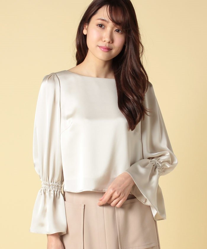 エレガントな光沢が印象的なサテンブラウス。袖口をフレアに仕上げたスリーブデザインが目を引く、華やかさのあるアイテム。丈が短めだから、ハイウエストのパンツともバランスよく着こなせます。